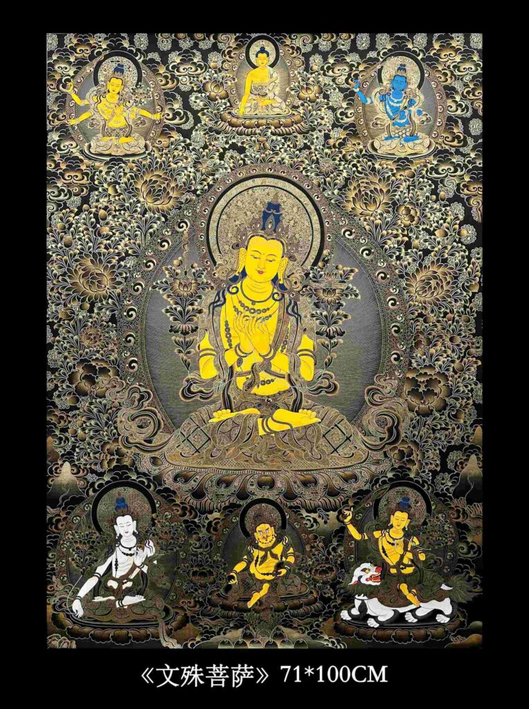 文殊头戴五佛冠,表示五方佛的五种智能,头顶作成五个发髻,表示内心已经证得五智,右手高举般若焰剑,表断一切无明、愚昧、昏暗。左手当胸作转法轮印,并拈青莲花梗,延手臂而上。花开齐于耳际,莲瓣上平放着般若波罗密多梵匣,表般若智能浩瀚如经典。一切珠宝璎珞表其报身圆满,以金刚双跏趺姿势安住于莲花日轮上。